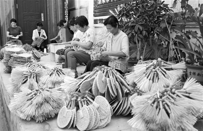 8月14日,山东省新泰市羊流镇的村民忙着利用当年麦收留下的麦秆,制作麦秆扇用于销售。目前,在羊流镇及周边乡镇从事麦秆扇加工制作的农户已达2万多人,麦秆扇产业拓宽了当地农户的增收致富路。新华社记者 徐速绘 摄