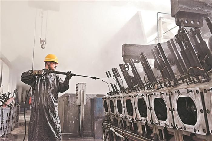 在中国铁路郑州局集团有限公司新乡机务段机车配件清洗库内,有3个大小不一的清洗池,水温高达100摄氏度,清洗工需要在闷热潮湿的环境中作业,彻底清洗配件内的油泥、积碳等杂质,以确保机车配件质量。图为配件清洗工对高温煮洗后的机体进行清洗。袁修航 摄