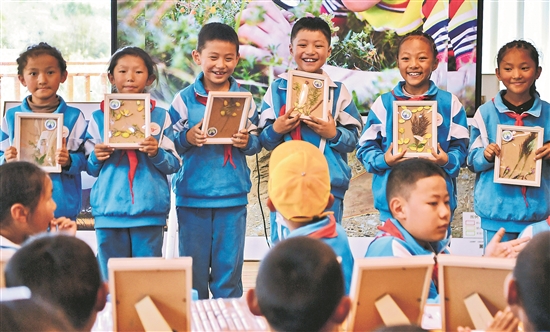 8月15日,拉鲁小学的学生在拉鲁湿地国家级自然保护区管理局科普小教室里向大家展示优秀植物标本。