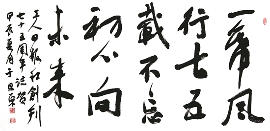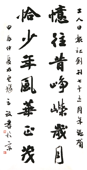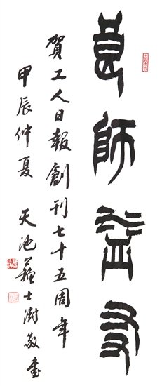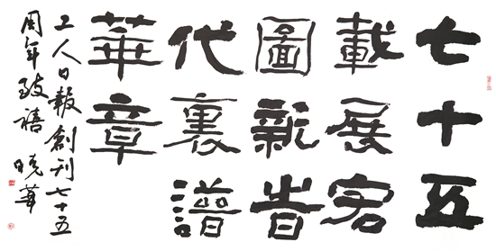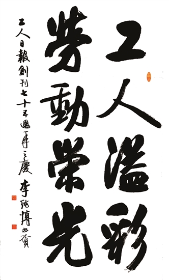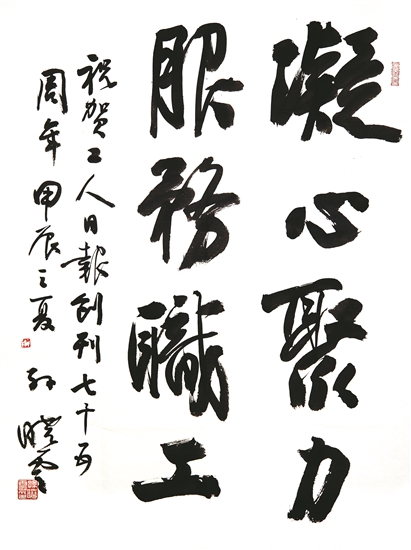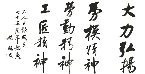 书法家小分队由中国职工文化体育协会会长李守镇带队,带来了中国书法家协会名誉主席张海、苏士澍和中国书法家协会主席孙晓云等书法名家专门为工人日报社书写的书法作品。活动现场气氛热烈,职工们手捧宣纸排起长队。中国职工书法家协会主席郑晓华与副主席李纯博、施恩波、于恩东,以及中国职工美术家协会主席杨中良等为职工们挥毫泼墨,翰墨抒情,也为工人日报社送上充满墨香的生日祝福。现选取部分书法作品进行展示,以飨读者。