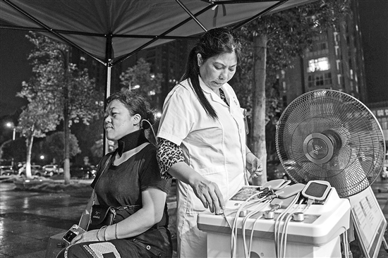 近日,湖南省常宁市卫健局举办“中医夜市”活动,医护人员变身“夜市摊主”,现场展示针灸、推拿、刮痧、耳贴、艾灸等传统技艺,免费为群众提供健康咨询和诊疗服务,吸引了众多市民前来“探店”。图为医护人员为市民做理疗。新华社记者 陈思汗 摄