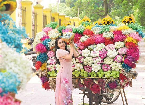 近日,一名身着奥黛的越南女子在河内街头一处鲜花流动摊前留影。越南首都河内是一座爱花的城市,夜晚的鲜花批发市场车水马龙,白昼里的卖花流动摊遍布大街小巷,多彩的鲜花点缀了河内的旖丽风光。新华社记者 刘天 摄