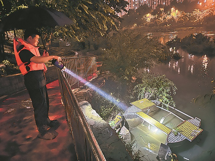 图为凉水河管理处大红门管理所工作人员当天夜间查看入河口情况。本报记者 蒋菡 本报通讯员 王一涵 摄