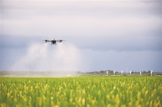8月16日,在北大荒集团黑龙江八五六农场有限公司第六管理区水稻地块,一架无人机在进行“一喷多促”作业。