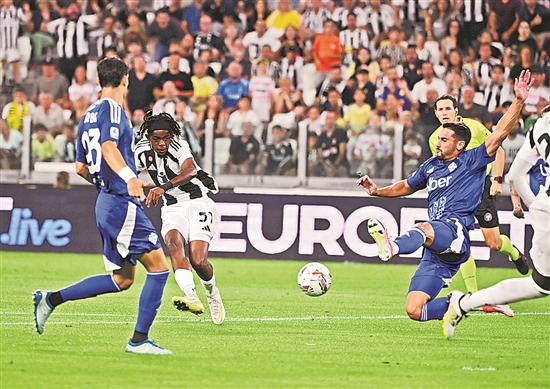北京时间8月20日,在2024-2025赛季意大利足球甲级联赛第1轮比赛中,尤文图斯队主场3比0战胜科莫队。图为尤文图斯队球员姆班古拉(中)在比赛中射门得分。新华社发(阿尔贝托·林格利亚 摄)