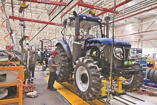 8月21日,在潍柴雷沃智慧农业科技股份有限公司拖拉机工厂总装车间,工人在装配智能拖拉机。