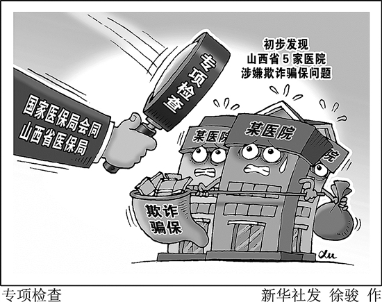 日前,国家医保局会同山西省医保局,运用大数据模型,对山西省部分城市医保基金使用数据作了筛查,根据可疑线索指向,对忻州市保德县德馨医院、代县和平医院,朔州市应县东城医院、济民医院、夕阳红华康医院进行了专项检查,初步发现涉嫌欺诈骗保问题。新华社发 徐骏 作
