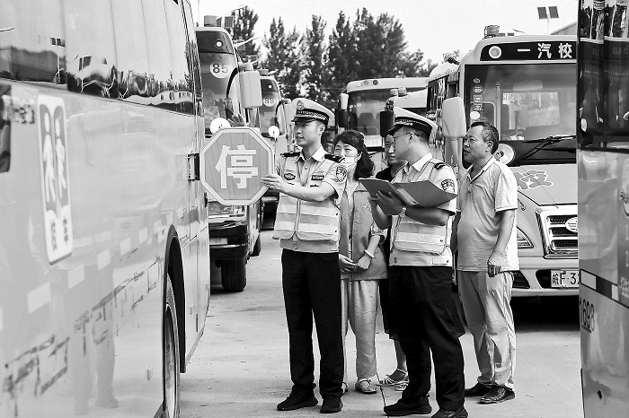 8月20日,安徽省淮北市公安局交警支队四大队民警对辖区一家校车服务有限公司的校车进行安全检查,保障学生乘车安全。本报通讯员 万善朝 摄