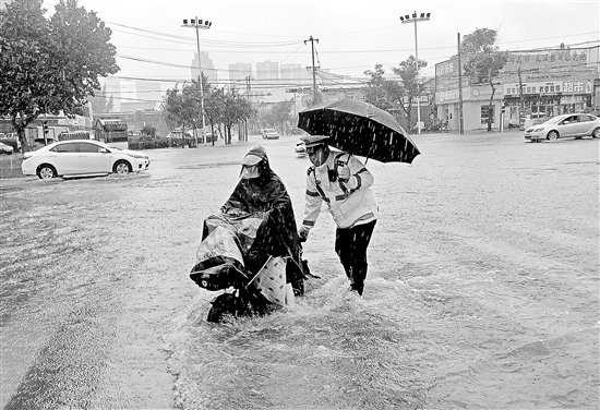 8月19日,山东省滕州市突降大雨,城区道路积水严重,滕州市公安局交警大队组织警力走上路面,做好暴雨天气道路交通疏导管控和群众救助工作。