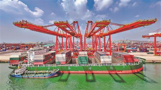 8月22日,在山东港口日照港集装箱码头,轮船在停泊作业。2024年1月至7月,日照港货物吞吐量同比增长6.1%,集装箱量同比增长11.1%。其中,外贸集装箱吞吐量同比增长13.2%,呈现稳中向好的发展态势。