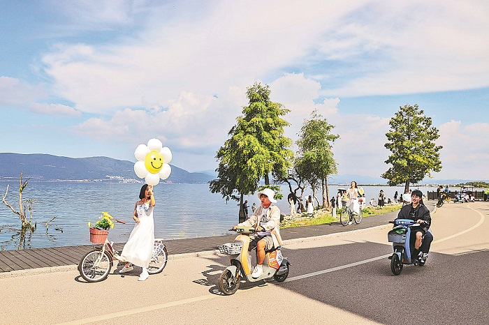 8月21日,在云南大理洱海生态廊道,游客骑行洱海湖畔,拍照打卡,感受生态美景。