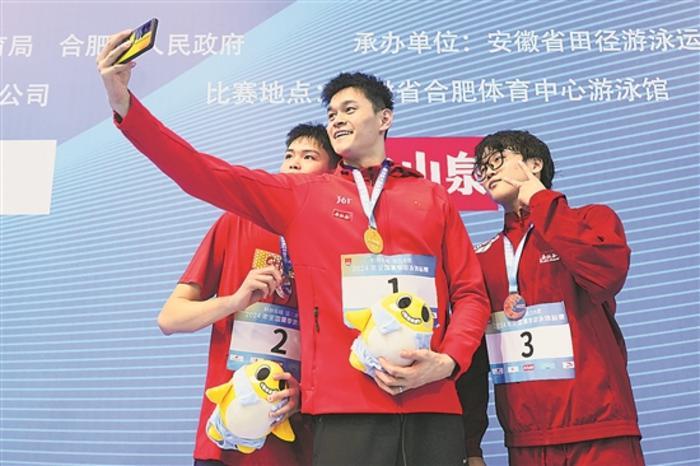 8月25日,冠军孙杨(中)、亚军徐海博(左)和季军徐一舟在颁奖仪式上合影。当日,在安徽合肥举行的2024年全国夏季游泳锦标赛男子400米自由泳决赛中,浙江寿仙谷队选手孙杨以3分49秒58的成绩获得冠军。新华社记者 杜宇 摄