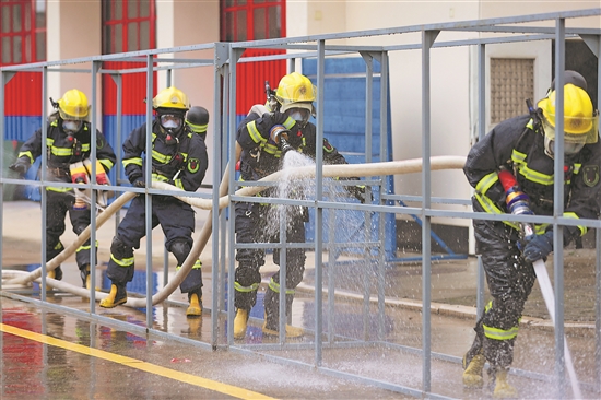 在福建厦门市集美区杏林消防救援站,俞建国(右二)与同事们进行“纵深灭火救人操”训练。