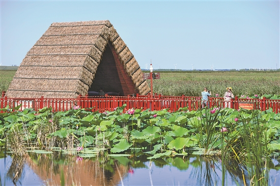8月26日,游客在吉林省松原市查干湖参观游览。