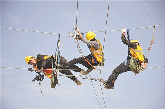 图为中铁电气化局集团北京电化公司工人正在施工。本报通讯员 郝玉虎 摄