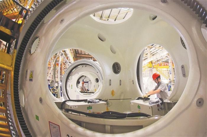 图为在江苏省国能联合动力技术(连云港)有限公司,工人正在组装风力发电机轮毂。本报通讯员 耿玉和 摄