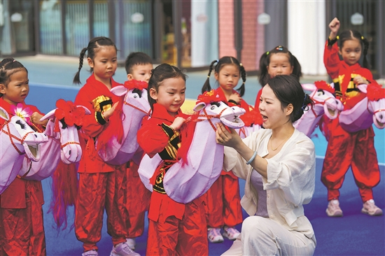8月29日,在浙江省长兴县开发区实验幼儿园,孩子们在老师的指导下学习非遗下箬马灯。本报通讯员 陈海伟 摄