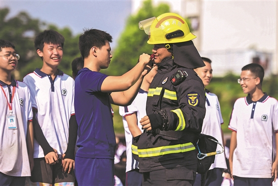 8月29日,湖南省道县第二中学,高一军训学生在消防救援工作人员的指导下学习消防安全装备穿戴。本报通讯员蒋克青 摄