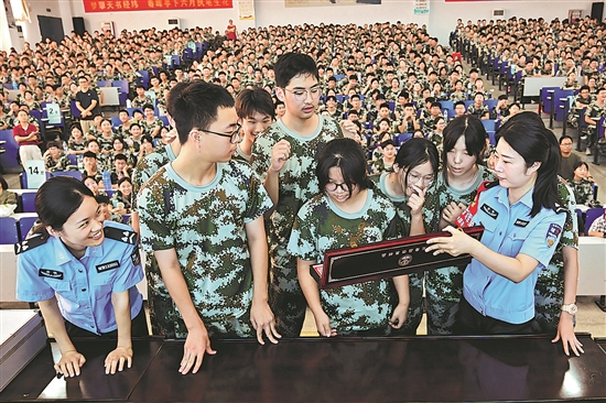 8月26日,在安徽省和县第一中学报告厅,民警为1000多名高一新生讲解毒品的危害。本报通讯员 秦祖泉 摄