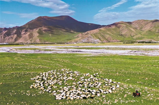 8月27日,新疆维吾尔自治区巴音郭楞蒙古自治州,牧民正赶着羊群行进在天山脚下,前往秋牧场。从8月末至9月初,新疆多地陆续进入秋季转场高峰期。