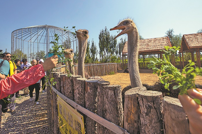 8月30日,位于内蒙古自治区鄂尔多斯市准格尔旗的准能生态示范区毓秀景区,游客们在复垦改造后的生物多样性生态公园内与鸵鸟互动。