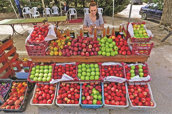 夏季是黎巴嫩苹果收获的季节。在黎巴嫩山省,当地人举办活动,庆祝苹果丰收。图为近日,在黎巴嫩山省,一名摊主在苹果节上售卖苹果。