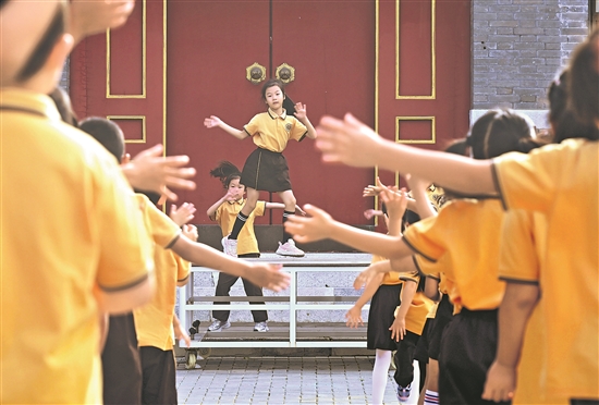 9月2日,北京第二实验小学学生在教室外锻炼。