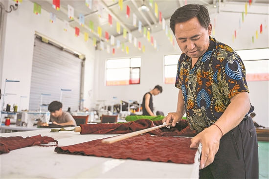 9月1日,在西藏日喀则市仁布县特色产业孵化园,亚德细褐羊毛织品农民专业合作社工作人员在车间里准备剪裁布匹。