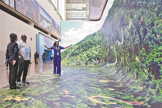 9月3日,两名非洲记者在2024年中非合作论坛峰会新闻中心参观超高清沉浸式体验项目。