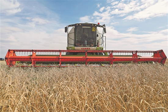 哈萨克斯坦北方多地9月进入春小麦收获季节。据哈农业部消息,截至当地时间9月3日春小麦收获面积已达300万公顷。图为近日,在哈萨克斯坦首都阿斯塔纳附近的农田,联合收割机收获小麦。新华社发(奥斯帕诺夫 摄)