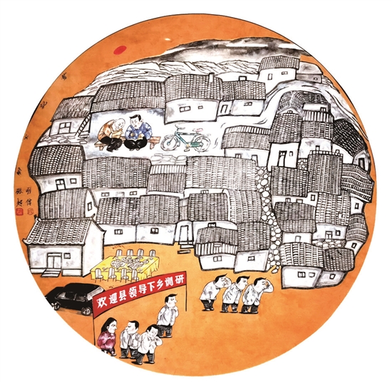 第十四届全国美术作品展览(综合画种)不久前在成都拉开帷幕,其中57件漫画作品在广大观众脸上留下数不清的笑痕。张超和陈明信创作的《书记下乡》,则令笔者眼前一亮。