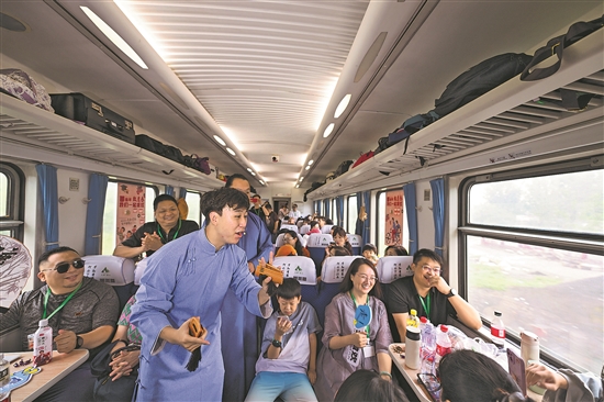 9月7日,相声演员在S910列车上为旅客表演快板。