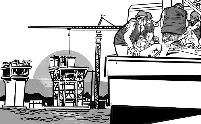 秀山岛,人很少。工地上的筑桥人,就是最热闹的一伙。再热闹,面对偌大的海,都显得孤寂。特别到了晚上,岛上居民、商家七八点就睡了,工人们想到岛上改善改善生活、买点东西,都困难。