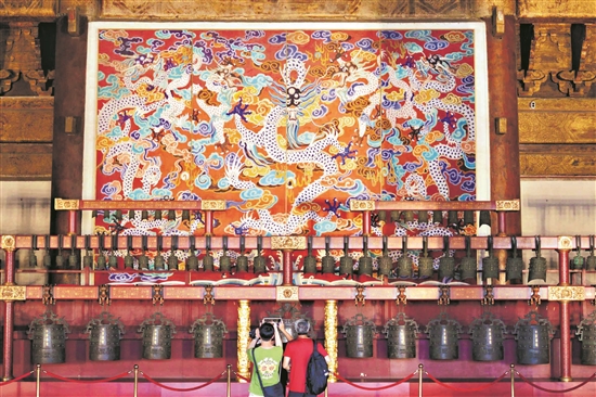 北京太庙享殿于近期恢复开放参观,殿内68根大柱皆为整根金丝楠木,最高的达13.32米,直径最大的达1.2米,殿顶用片金沥粉彩画装饰,地面墁铺金砖。殿内气势恢宏,在中轴线历史建筑群体中极具代表性。