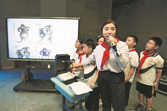 9月9日下午,在江苏省南京市琅琊路小学明发滨江分校,江苏省邮政工匠、南京邮政邮务部职工沈琳和学生观察紫光灯照射下的邮票。