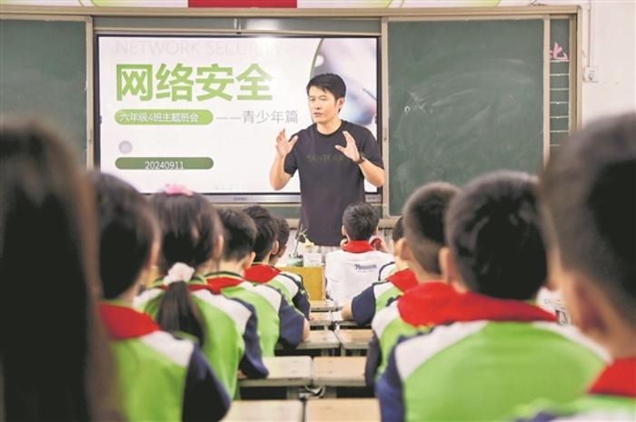 9月11日,河南省洛阳市汝阳县第二实验小学的老师给学生们普及网络安全知识。9月9日至15日,2024年国家网络安全宣传周在全国范围内统一开展。多地学校组织活动,宣传网络安全理念、普及网络安全知识、推广网络安全技能。新华社发(康红军 摄)