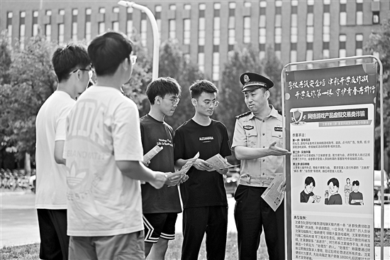 9月5日,在天津大学北洋园校区,公安民警为大学生宣传网络游戏产品虚假交易类诈骗防范知识。当日,天津市公安局刑侦总队、内保总队在天津大学开展“开学反诈第一课”集中宣传活动。 新华社记者 孙凡越 摄