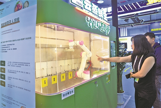 9月12日,在2024全球工业互联网大会创新成果展上,参展商向参观者介绍智能鲜蒸无人厨房。
