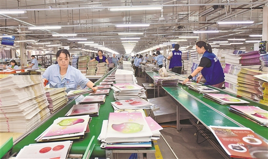9月11日,位于肃宁县的河北彩和坊印刷有限公司工人在生产线上工作。