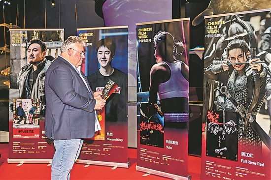2024澳大利亚“中国电影周”开幕式近日在澳首都堪培拉举行。图为当地时间9月11日,在澳大利亚首都堪培拉,一名男子站在电影周影片海报前。
