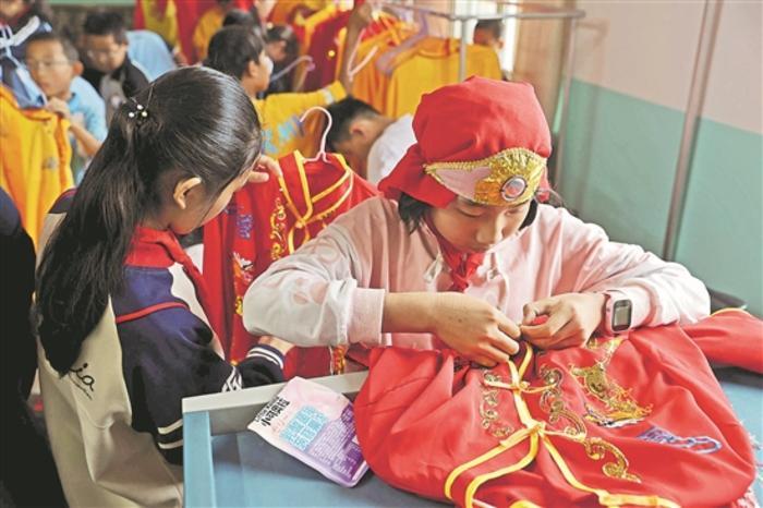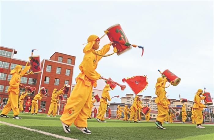 据相关负责人介绍,近年来皋兰县将非物质文化遗产兰州太平鼓纳入各中小学课后服务内容,启动“家乡文化我传承”——非物质文化遗产兰州太平鼓进校园活动,成立中小学太平鼓队13支,聘请兰州太平鼓非遗传承人入校开展太平鼓技艺传授,让孩子们在体验非遗魅力的同时,切实提升学生的民族自豪感和文化认同感,深受同学们的喜爱。本报记者 吴凡 摄