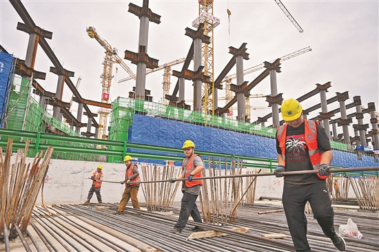 图为9月15日,中国建筑股份有限公司工人在雄忻高铁雄安地下段及相关配套工程建设现场搬运钢筋。