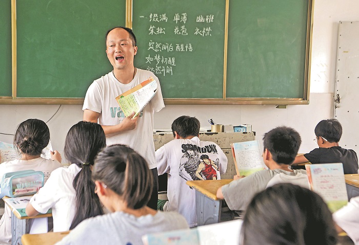 近日,安徽省淮南市寿县丰庄镇合庙小学周勇老师在黑板上书写板书,为学生讲解课文。