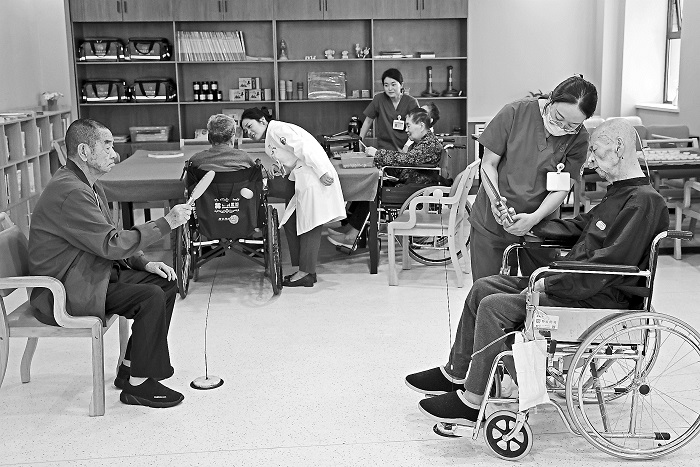 近日,在甘肃省兰州市西固区中医医院康复分院的老年活动室,老人们在进行康复。据介绍,该院与1家养老公寓、4家街道综合养老服务中心签订了医养结合服务协议,对老人进行健康管理。目前,已有超两万名老年人纳入该院健康管理体系。本报记者 吴凡 摄