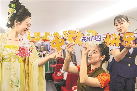 9月16日,在G1005次列车上,列车工作人员布置迎中秋装饰挂件。当日是中秋假期第二天,人们以丰富多彩的方式度过假日。