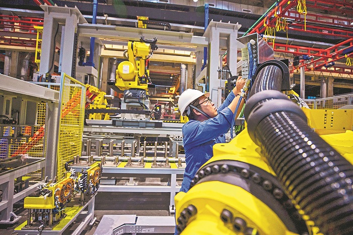 图为8月30日,在设备维修中心发动机车间,工人正在安装矿用大马力发动机数字化检修系统。本报记者 蔚可任 摄