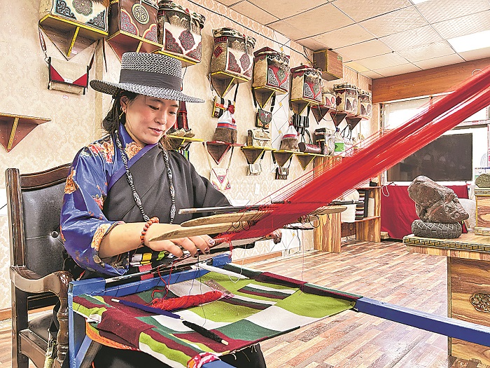 9月11日,在西藏自治区那曲市比如县恰则乡曲荣夺村水磨糌粑合作社,大厅里挂满了样式新颖、造型别致的藏式包、糌粑袋、门帘等手工艺品。35岁的村民央嘎正在用传统藏式编织工艺制作藏服腰带。