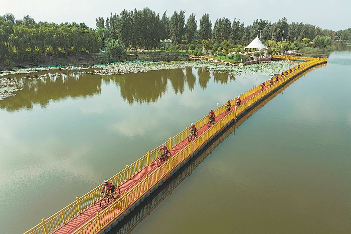 近日,骑行爱好者在山东省滕州市九龙湾湿地公园健身骑行。该湿地公园原属一处煤矿塌陷地区域,当地坚持生态保护优先的原则,在煤矿塌陷地培育出生态观光、光伏新能源、种植养殖等业态。本报通讯员 孙杨 摄