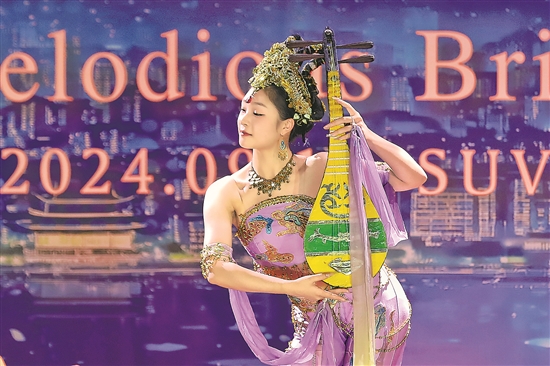 图为当地时间9月17日,在斐济苏瓦市政厅,演员在“知音湖北·遇见斐济——天涯共此时中秋晚会”上表演。新华社发(桑钦龙 摄)