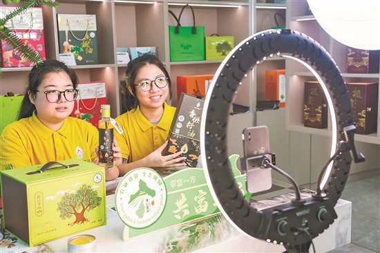 图为9月19日,主播在销售香榧及香榧油、香榧酒、香榧皂等衍生产品。